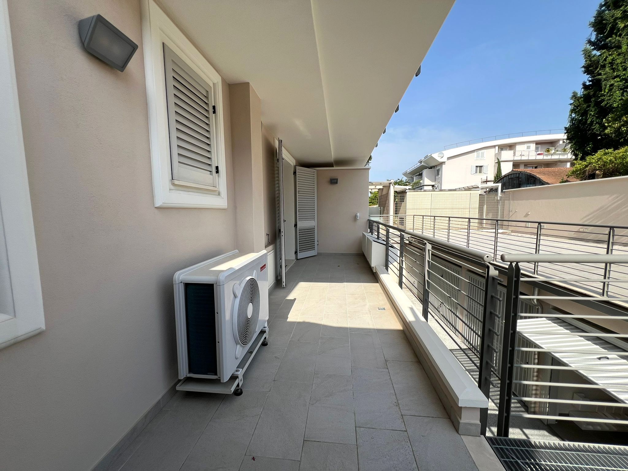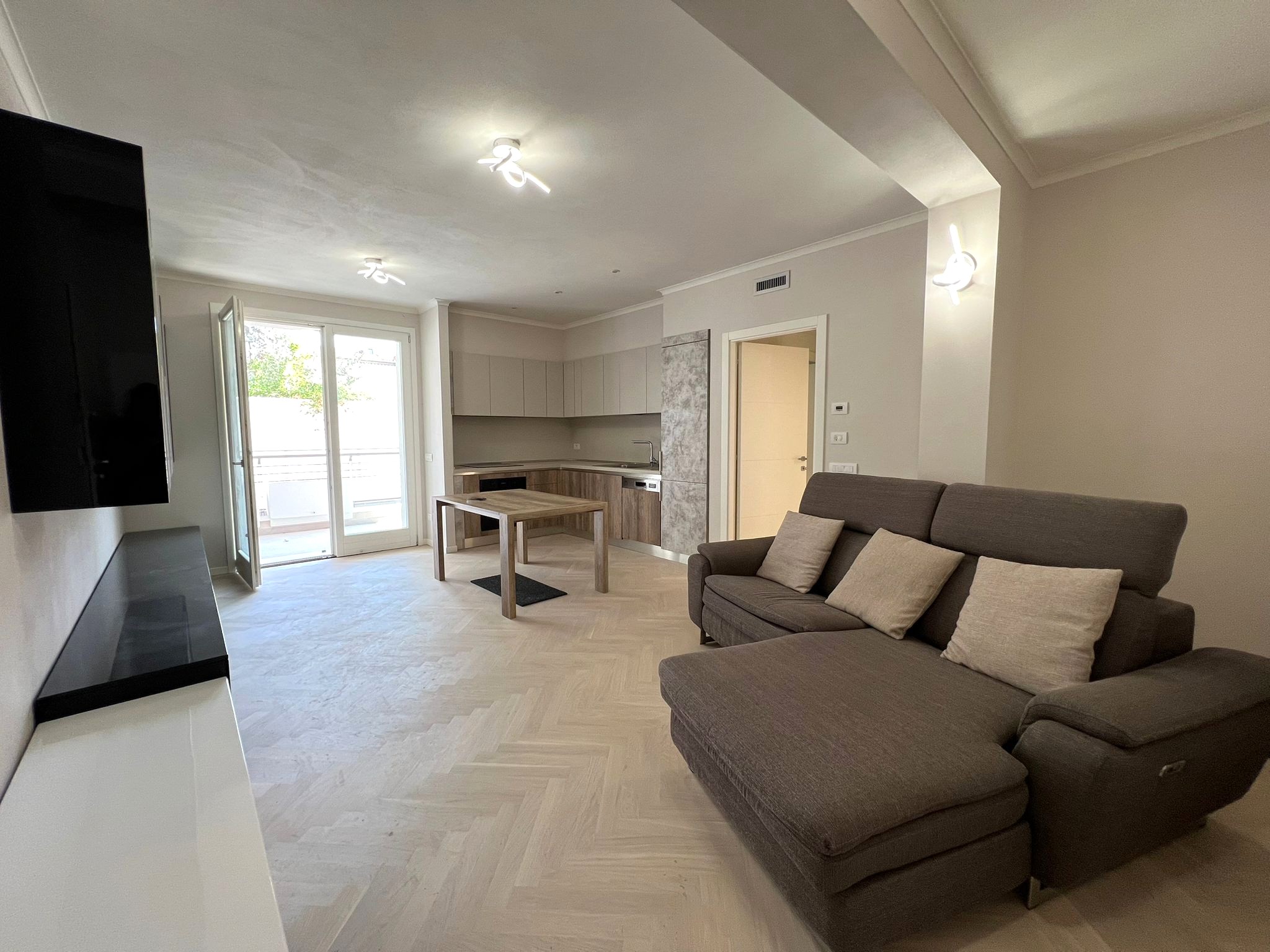 L'appartamento al piano terra è così composto: ingresso-soggiorno-pranzo con angolo cottura, disimpegno, camera matrimoniale, camera singola, bagno, loggia di 18,20 mq e terrazzo di 79,15 mq. Dotato di garage di 15,00 mq